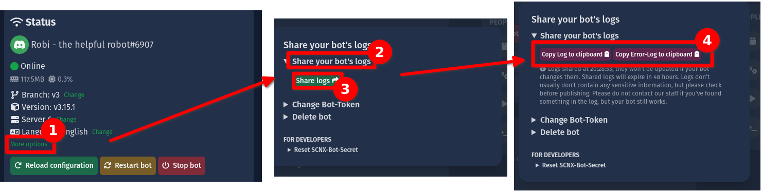 3. Click on "Share your bot's logs" and then press the button "Share logs". Your Bot-Host will now upload the logs of your bot to paste.scootkit.net. This might take a few seconds.